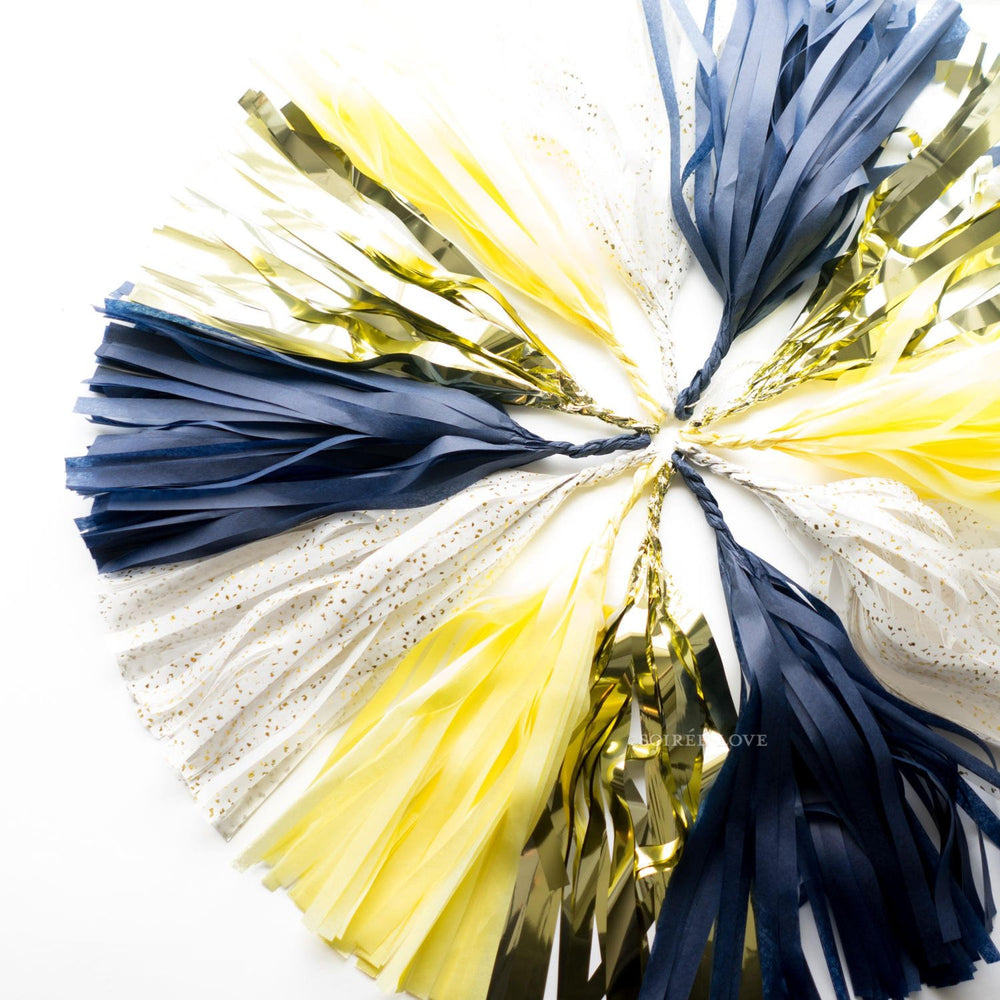 This garland contains alternating metallic gold, yellow, speckled gold, and midnight blue tissue tassels. Can be used as home decor, party decor, or as a photo prop, tassels can be moved around and/or removed easily.
