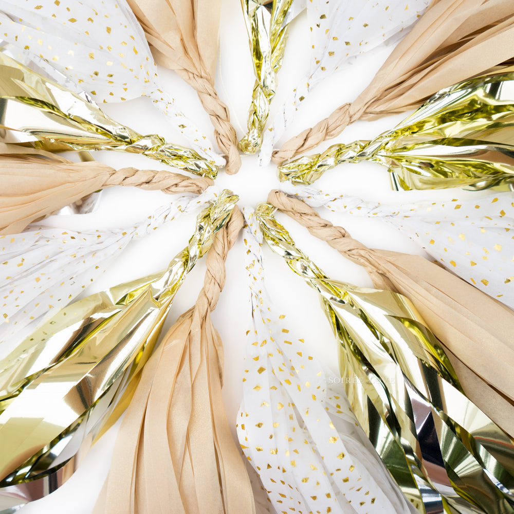 This garland contains alternating shimmer gold, metallic gold, and speckled gold tissue tassels. Can be used as home decor, party decor, or as a photo prop, tassels can be moved around and/or removed easily.