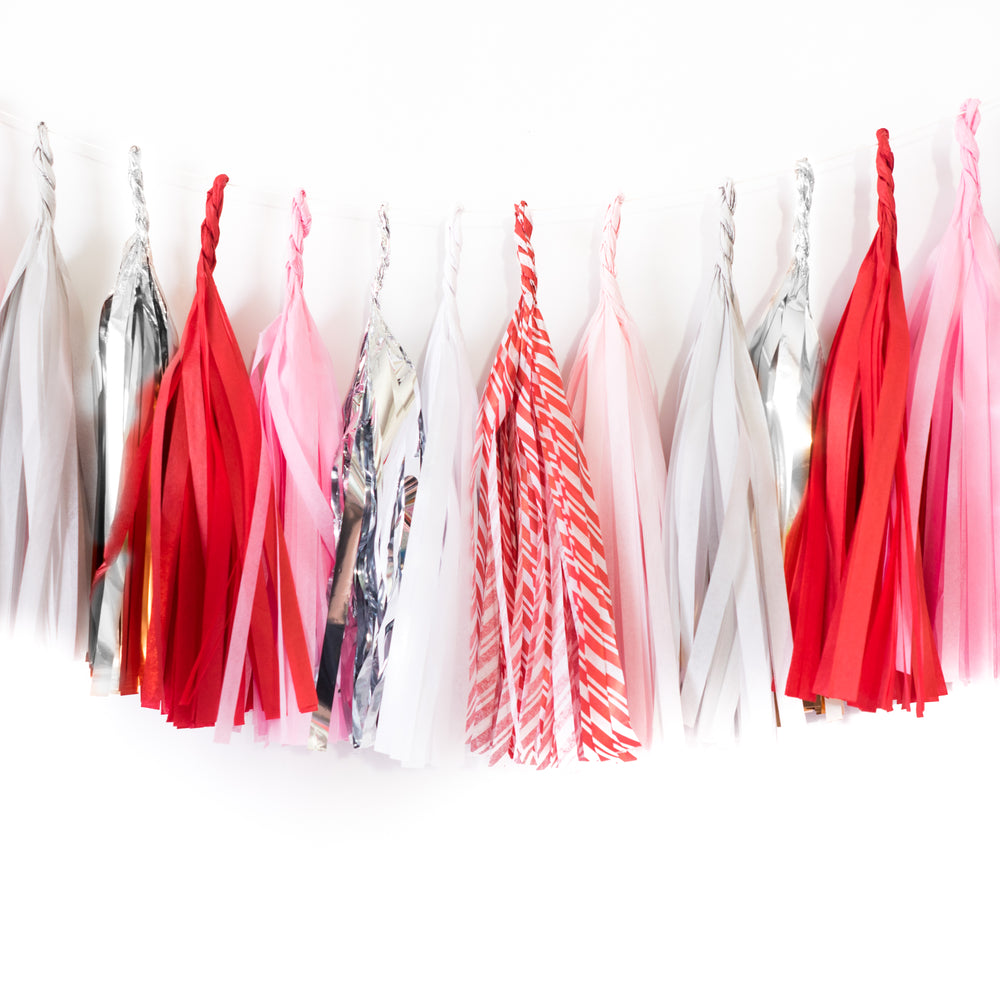 Bring out your holiday spirit with this Pink Candy Cane tassel set! Pink Cane paper tassels contain a holiday blend of silvers, red, pink, gray, white, and candy stripe paper tassels. Can be used as home decor, party decor, or as a photo prop, tassels can be moved around and/or removed easily.