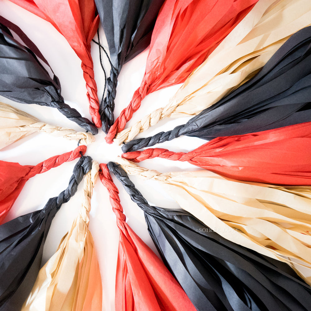 This garland contains alternating dark red, black, and shimmer gold tissue tassels. Can be used as home decor, party decor, or as a photo prop, tassels can be moved around and/or removed easily.