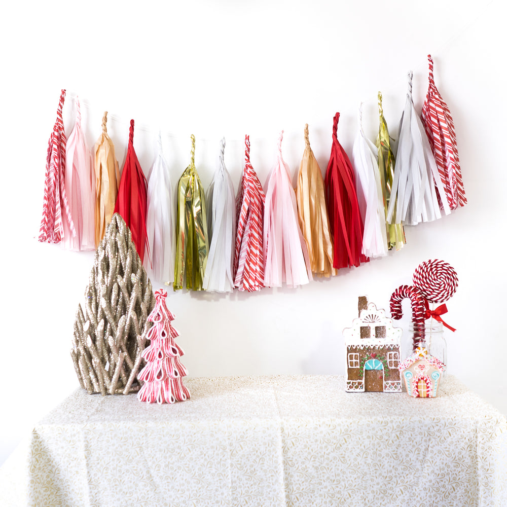 Bring out the fun Christmas spirit with this fun Be Merry Script Balloon Banner. Available with our without Candy Cane tassels which contain a holiday blend of red, pink, gray, white, and candy stripe paper tassels. Available in gold or silver tone. If you choose silver letters, tone in tassels will be silver. If you choose gold letters, tone in tassels will be gold.
