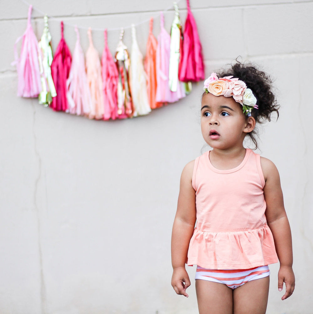 This garland contains alternating metallic gold, light pink, coral, peach, metallic copper, island pink, peach, baby pink, and boysenberry tassels. Can be used as home decor, party decor, or as a photo prop, tassels can be moved around and/or removed easily.